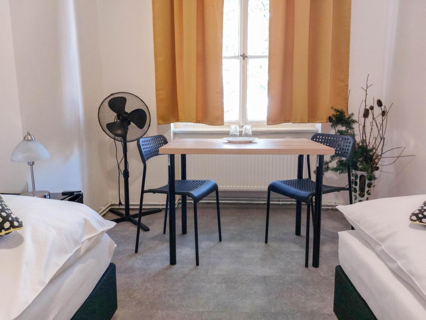 Standard Twin Room. Providing free toiletries, this twin room includes a shared bathroom with a shower and a hairdryer. Meals can be prepared in the kitchenette, which comes with a refrigerator, a microwave and a tea and coffee maker. Among the room amenities are a seating area, a wardrobe and heating as well as a quiet street view.