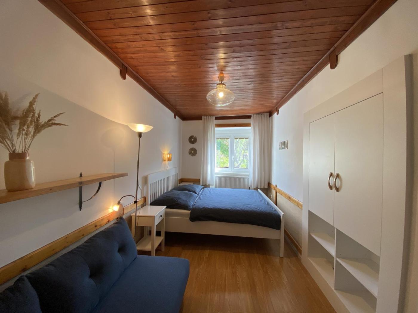 Double Room with Extra Bed. The double room provides a seating area and a wardrobe, as well as a private bathroom featuring a shower. Guests can make meals in the kitchen that is equipped with a stovetop, a refrigerator, kitchenware and a microwave. The double room has parquet floors, a sofa, an electric kettle, heating as well as garden views. The unit offers 2 beds. ;